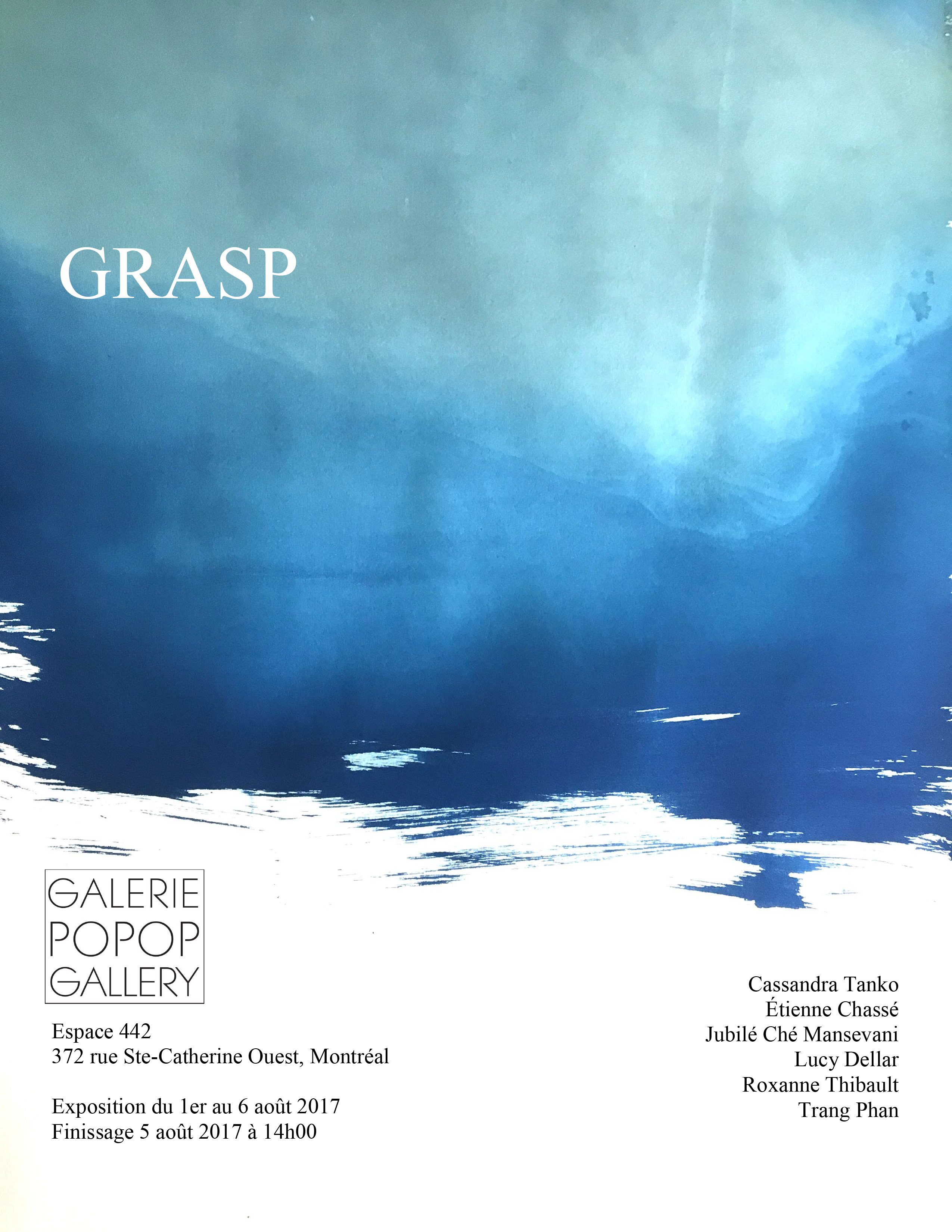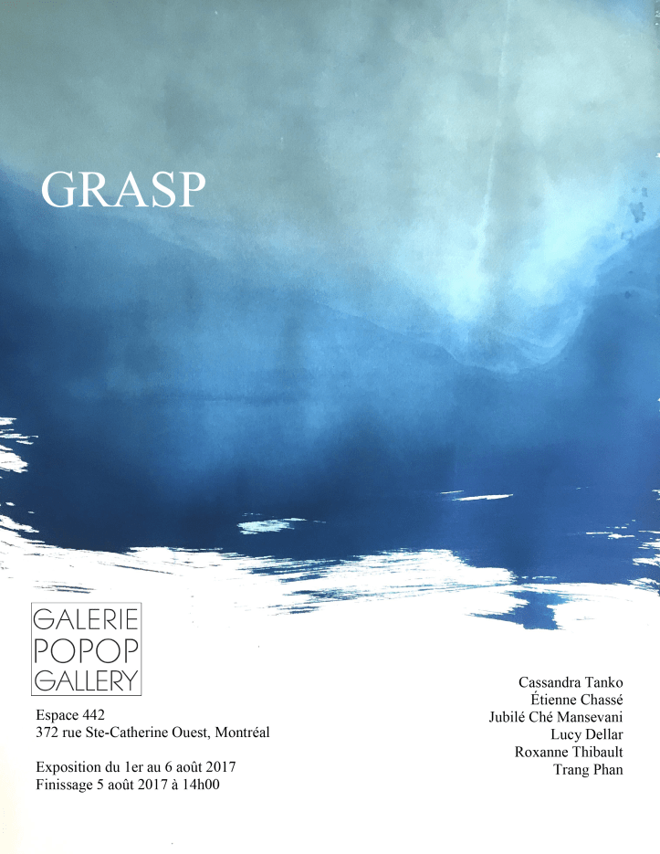 1 août 201710 août 2017Galerie POPOP Gallery Grasp // Concordia University Fine Arts students Exposition du 1er au 6 août 2017 Tous les jours : 11h00 à 17h00 Jeudi jusqu’à 20h Finissage samedi le 5 août, 14h00 à 17h00 Partager : Cliquer pour partager sur X(ouvre dans une nouvelle fenêtre) X Cliquez pour partager sur Facebook(ouvre dans une nouvelle fenêtre) Facebook J’aime chargement…