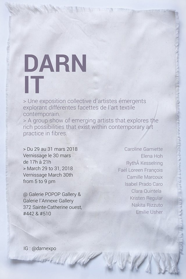 L’exposition collective DARN IT des étudiants en art textile de l’université Concordia présentée du 29 au 31 mars 2018!