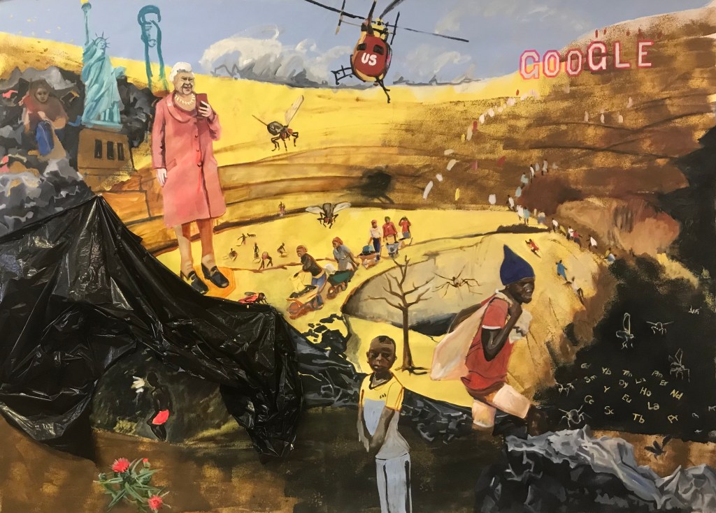 Anthropocene, the era of Homo sapiens. This series of paintings recaps the chaotic world we live in and highlights the connectivity of our actions. With a slow start in 2018, and with a growing sense of urgency, these large (7’X5′) oil and acrylic paintings are inspired by the stories we witnessed from near or from far. I approach the subject with a humor that questions rather than blames because I am also part of this world and my actions contribute to the global confusion. The inconsistency in the scale of the juxtaposed elements is intended to illustrate this chaos. In all the paintings, biblical or historical characters symbolize the hypocrisy of any self-proclaimed moral authority.