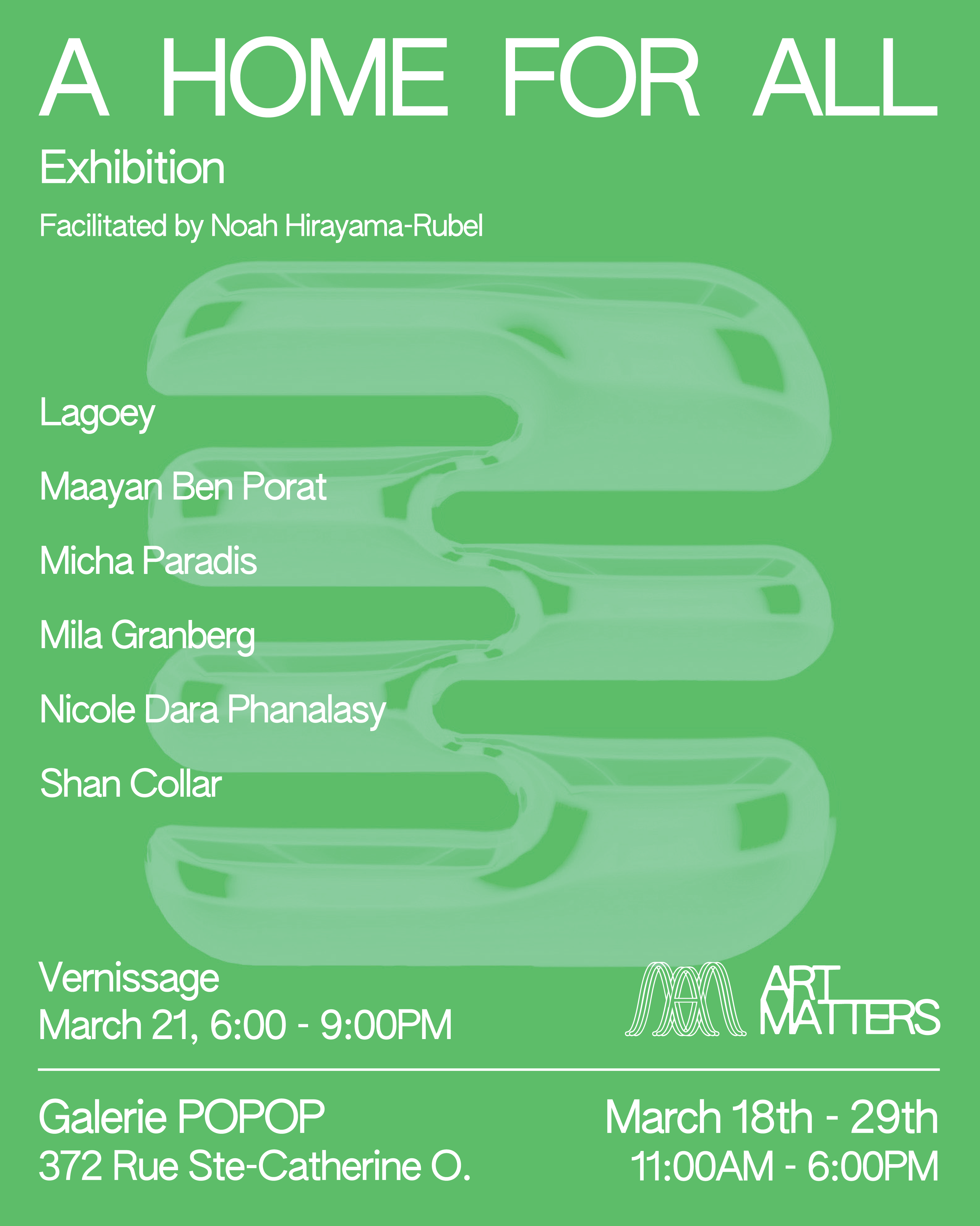 A Home for All is part of the 25th edition of Art Matters Festival! Art Matters is North America’s largest student-run Fine Arts festival that takes place every year in March. Since 2000, Art Matters has hosted exhibitions and events across Montreal creating platforms and opportunities for undergraduate artists studying at Concordia University.