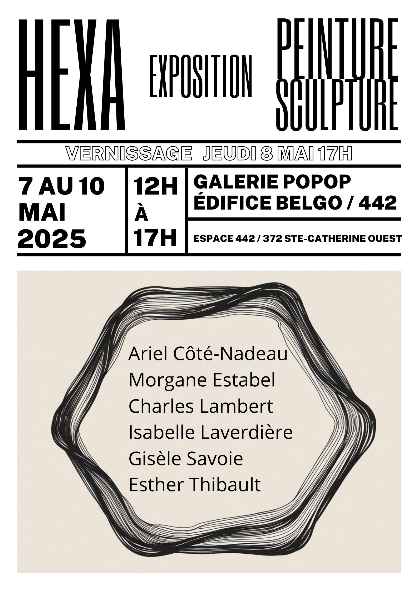 Nous sommes six étudiants au baccalauréat en arts visuels et médiatiques à l’UQAM, explorant les fondements de la peinture: surface, couleur, matérialité, espace. Nous questionnons sa plasticité, sa frontalité et ses liens entre sujet et image, cherchant à dépasser la représentation pour enter dans une matérialité brute et expérientielle. Le projet Hexa est né du désir d’exposer le fruit de notre travail, de nos explorations et recherches, après notre rencontre dans le cours « Peinture, éléments fondamentaux » enseigné par Jean Marois. Une opportunité précieuse pour se faire connaitre et acquérir de l’expérience. Composé de six parties distinctes formant un tout, il révèle une surprenante harmonie entre nos esthétiques, tant picturales que symboliques. Nos oeuvres interrogent notre lien à la société, à l’environnement et à la condition humaine.