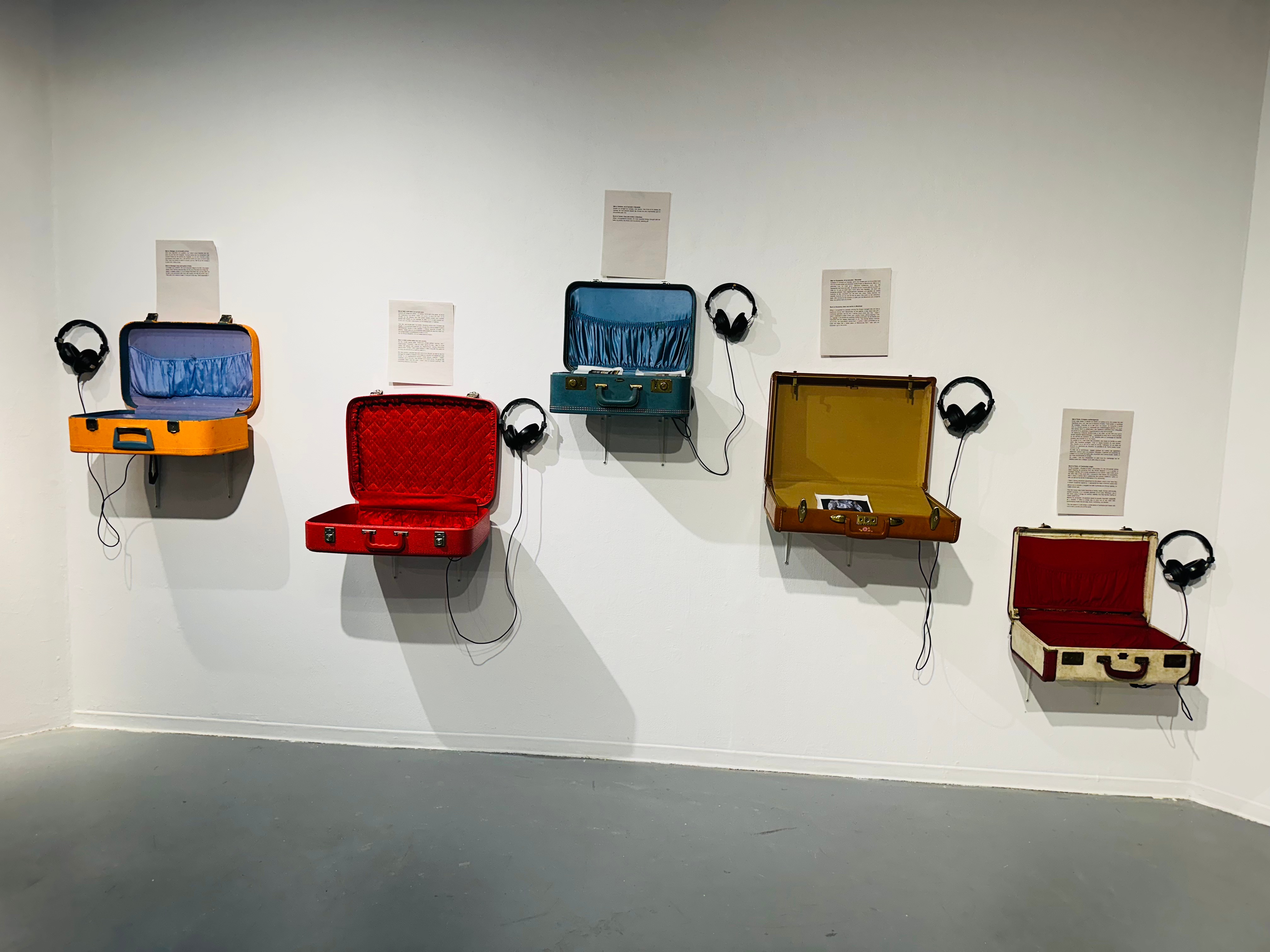À travers une installation diptyque mêlant images imprimées et récits vocaux recueillis auprès de personnes immigrantes originaires des quatre continents, l’artiste propose une immersion dans ces valises qui deviennent, tout comme un musée ou une galerie, un lieu mouvant d’écoute où l’intime rencontre le collectif.